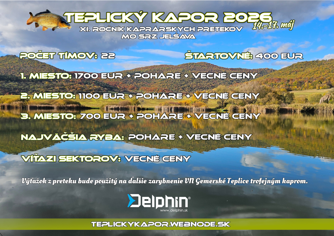 Po desiatich úspešných ročníkoch, MO SRZ Jelšava usporiada pre priaznivcov športového rybolovu XI. ročník rybárskych pretekov v love kapra, Teplický kapor 2026. Preteky sa uskutočnia na VN Gemerské Teplice v dňoch 14. - 17. máj 2026.